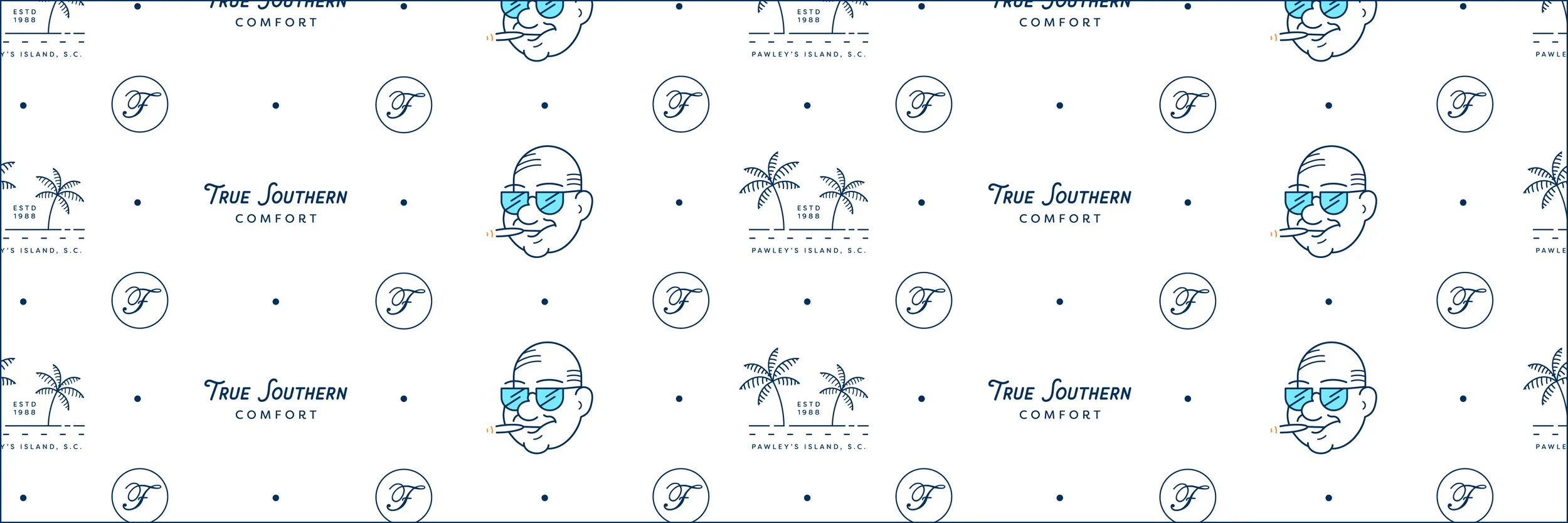 Pattern Design This pattern brings together all the core brand elements, including the destination logo, Frank’s caricature, the “True Southern Comfort” slogan, and the classic ‘F,’ into one versatile design. It captures the playful, laid-back feel of Pawley’s Island along with the warmth of Southern comfort food, keeping the brand consistent and easy to recognize. Whether paired with the full restaurant logo or the new caricature logos, it adds a fresh, flexible look that would fit perfectly across other design endeavors.