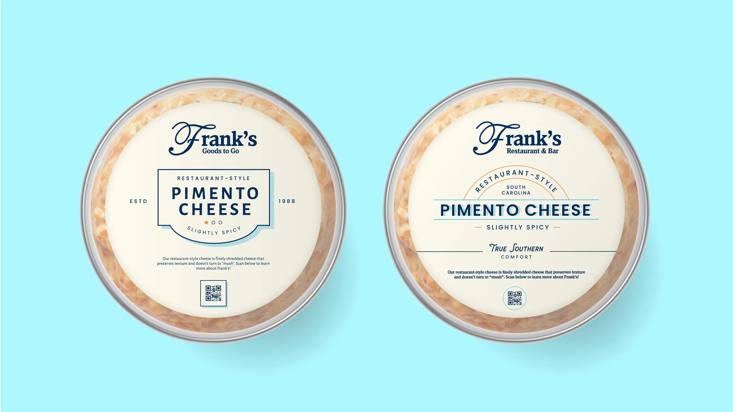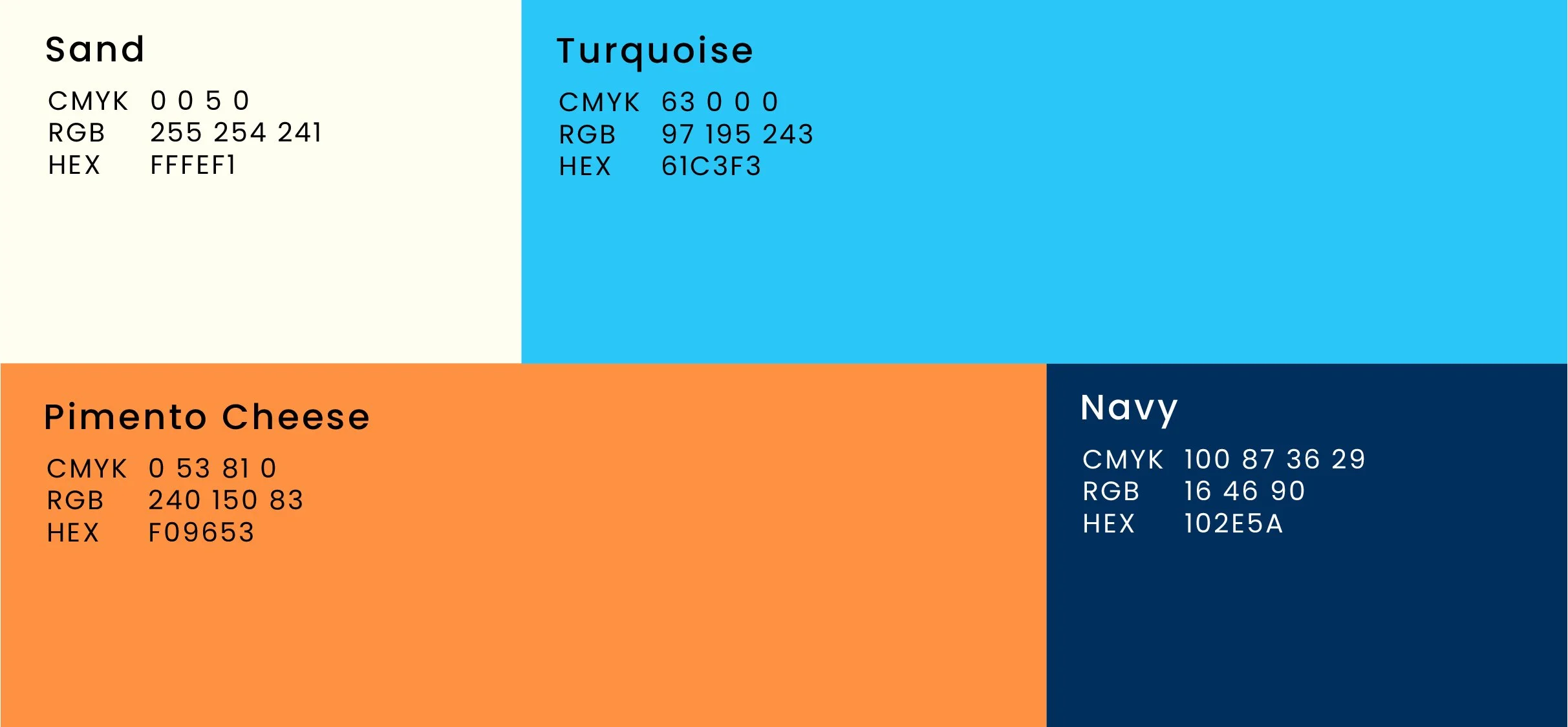 New Brand Colors The color palette for Frank’s Pimento Cheese mixes classic and playful vibes. Navy feels timeless and trustworthy, like a family recipe. Turquoise adds a burst of fun, keeping things light and modern. The pimento cheese orange ties to the product and feels cozy and inviting. The sandy hue in the packaging brings a soft, beachy touch that makes the brand feel friendly and easygoing. Altogether, the colors feel nostalgic yet fresh, giving the brand a warm, down-to-earth personality.
